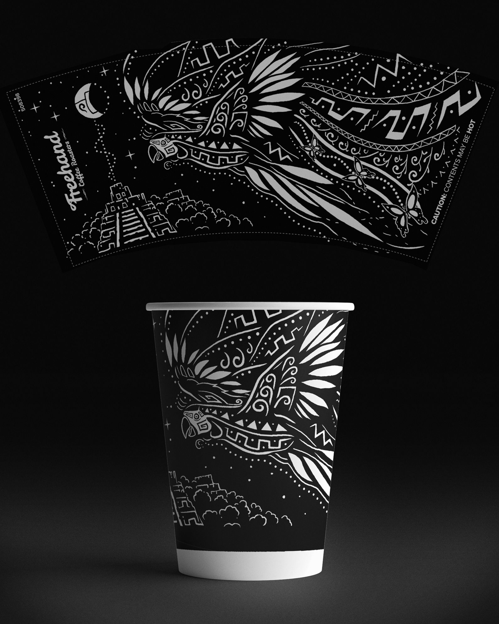 These cup designs for Freehand Coffee Roasters celebrate culture, storytelling, and connection through bold, hand-drawn illustration. Each design transforms the cup into a canvas—featuring mythic symbols, ancestral figures, and intricate patterns—that echo the origins of coffee and the hands that bring it to life. Together, they reflect Freehand’s ethos of craft, creativity, and community, making every coffee a moment of art as well as taste.