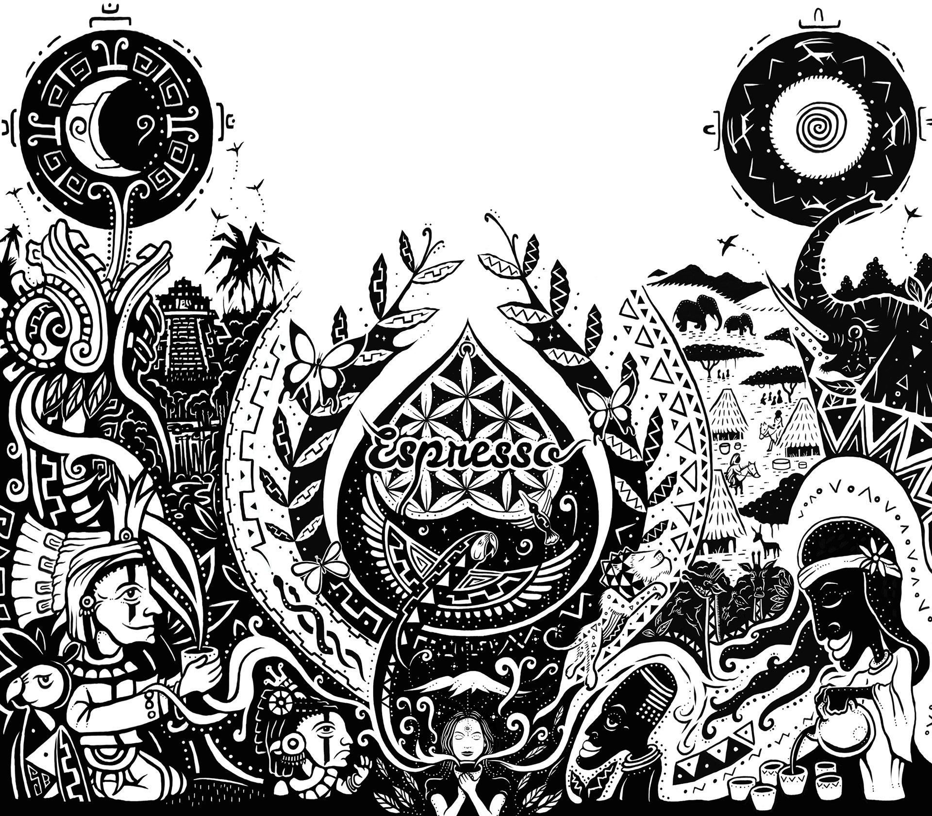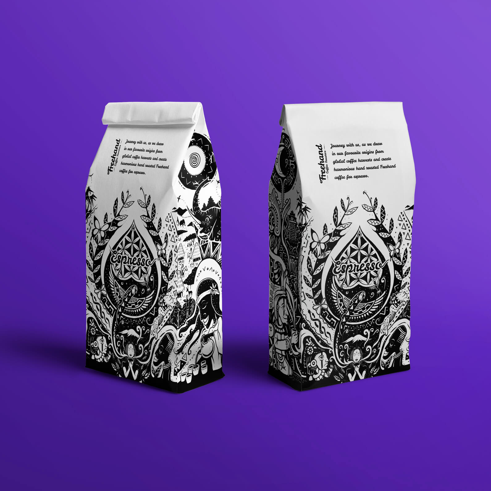 Illustrated packaging design for Freehand Coffee Roasters, exploring the “spirit of coffee” through a rich, symbolic visual narrative. The artwork weaves together elements from coffee-growing regions and cultures, blending natural forms, mythology, and ritual into a unified composition.